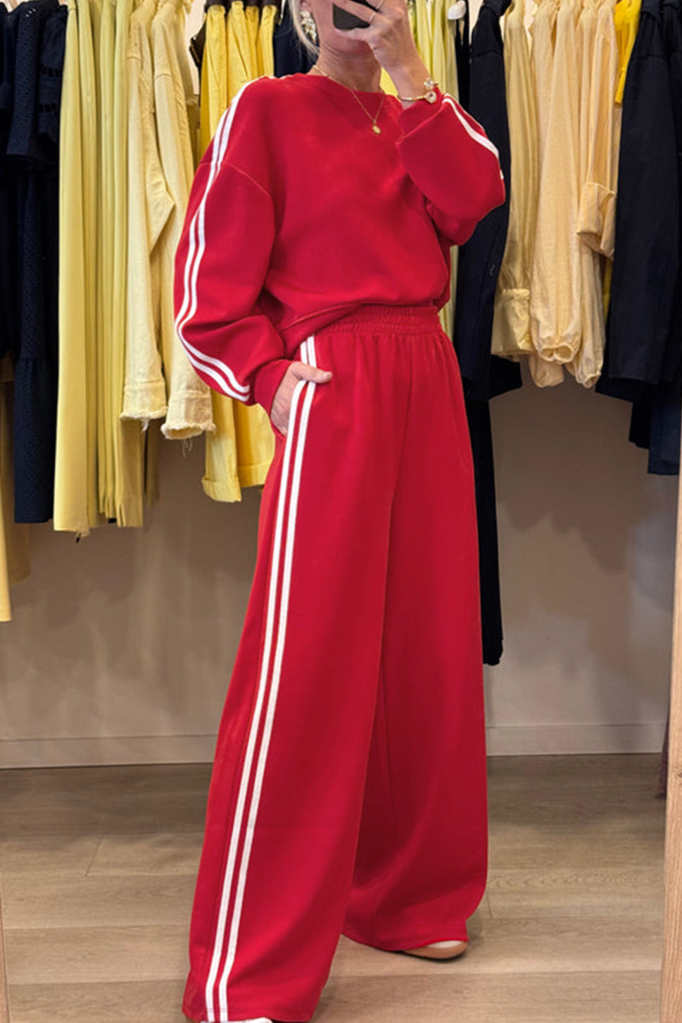 Elevate your casual wardrobe with the Red Varsity Set LT, a stylish two-piece outfit featuring classic varsity stripes for a sporty edge. The cozy crewneck pullover keeps you comfortable throughout the day, while the high-waisted elastic sweatpants provide a secure, flattering fit. Perfectly suited for running errands, workouts, or relaxing at home, this set combines fashion and function effortlessly.